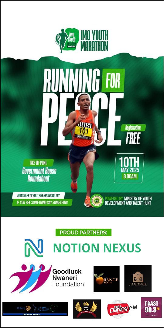 The debut edition of Imo Youth Marathon dubbed Running for Peace will shake the city of Owerri, the Imo State capital this Saturday May 10th, 2025 with the winners in both male and female assured of N500,000 each among other consolation cash prizes.